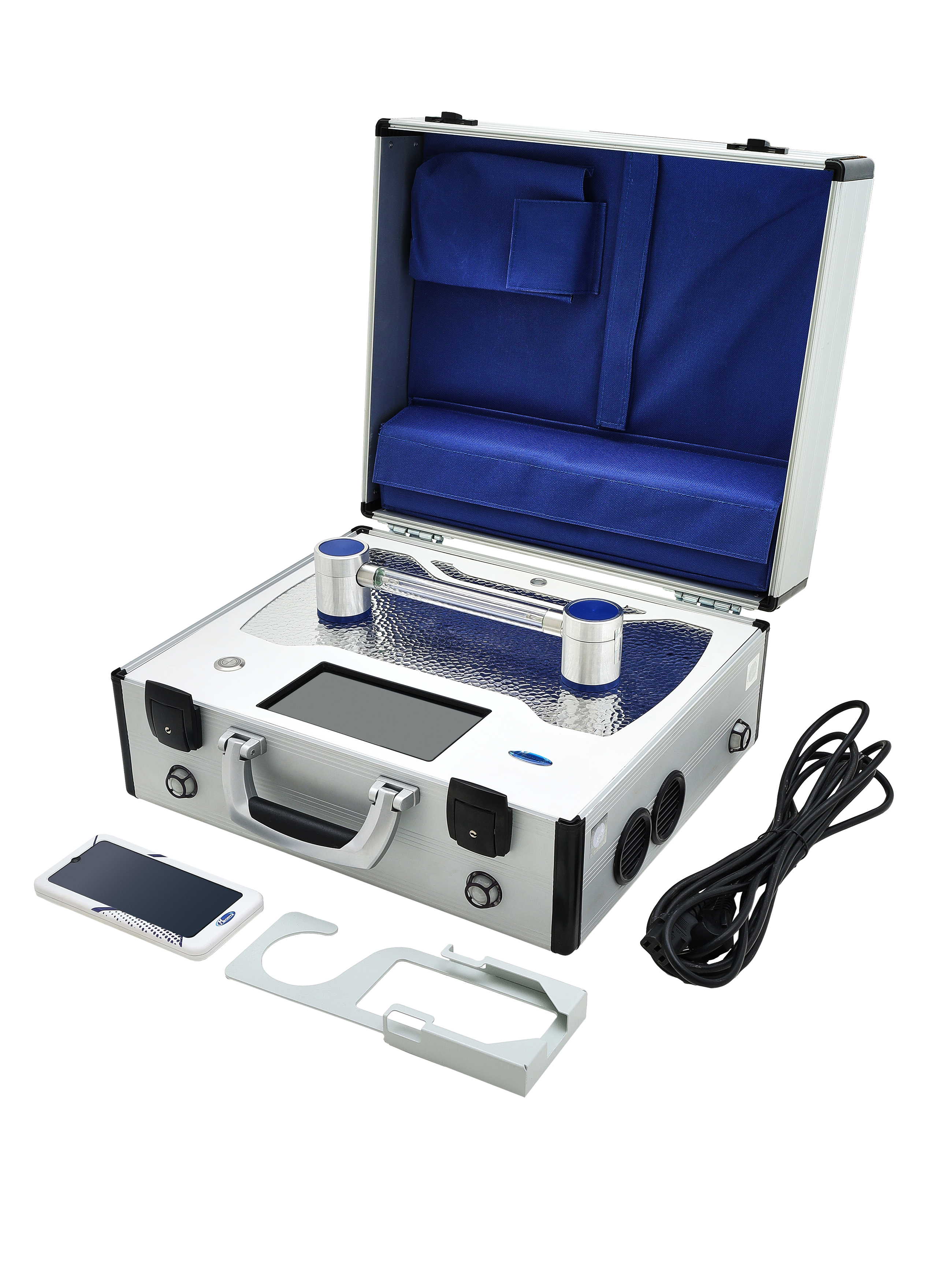 - Синхронизированные между собой сенсорная панель и пульт дистанционного управления, служащие для одновременного регулирования деятельности всех систем импульсного УФ-обеззараживателя и выведения сообщений о возникновении неисправностей и информации о наработанном в импульсах ресурсе ксеноновой лампы.