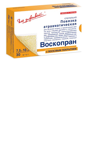 Воскопран – стерильная повязка из синтетической сетки, пропитан- ной пчелиным воском, не оставляет в ране волокон. Пчелиный воск обладает бактерицидным, противовоспалительным и ранозаживляю- щим свойствами, хорошо смягчает кожу, предотвращает ее обезвожи- вание, образуя полупроницаемую пленку.